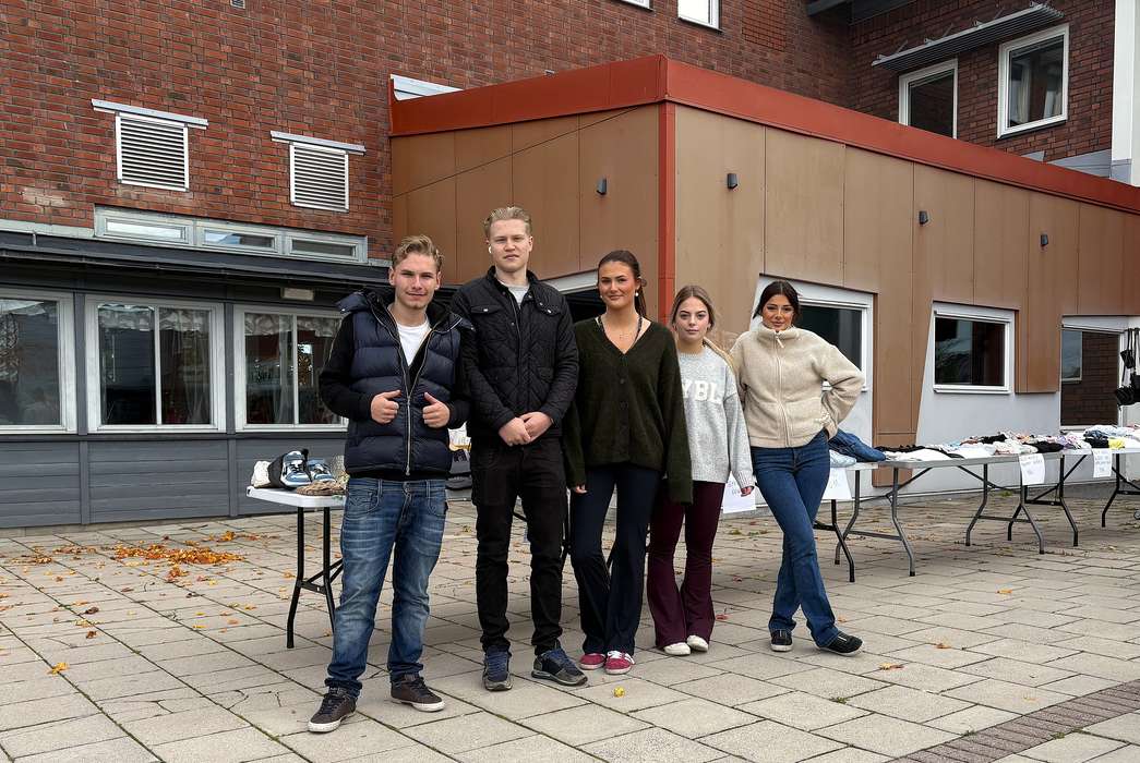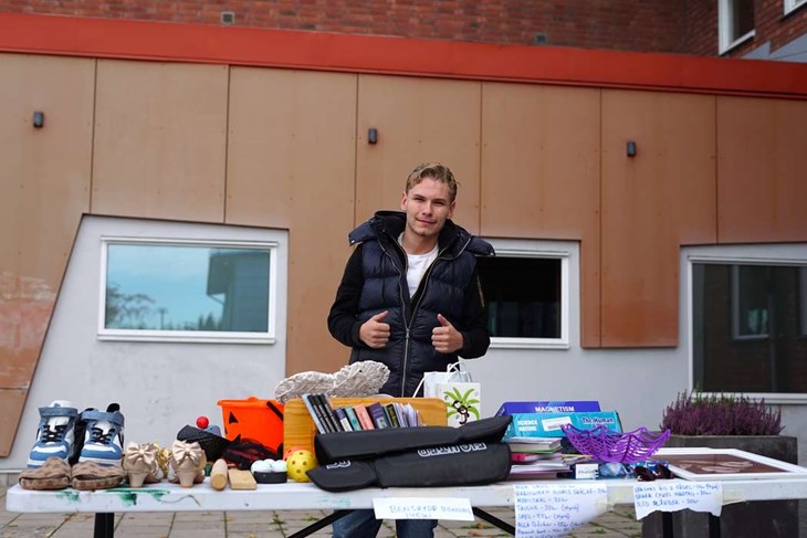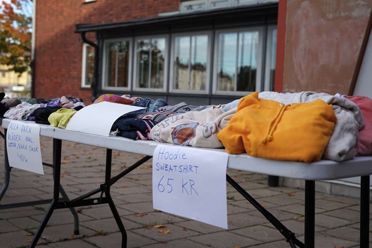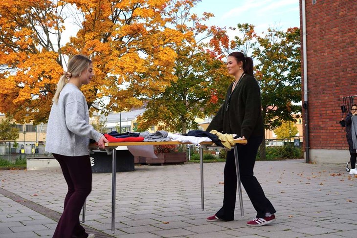 En kall lördagsmorgon hade andraårs-elever på Försäljning och servicelinjen på Vallentuna gymnasium ställt upp bord och klädhästar vid gymnasiets ingång. Fika med kärleksmums och kaffe hade dukats upp och några Vallentunabor tittade runt bland kläder och saker.
