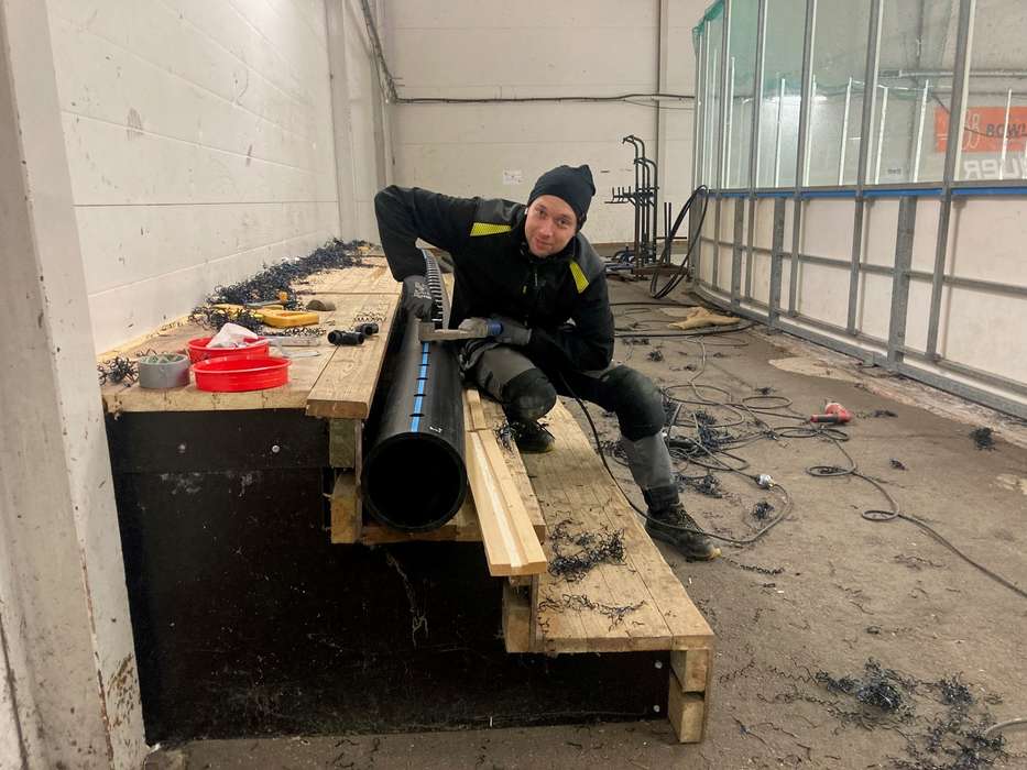 När Vallentuna Nya besöker hallen sitter Piotr från entreprenören Spice Tec och pressar ner rörkopplingar i ett av stamrören som ska anslutas till myllret av smårör under ispisten.