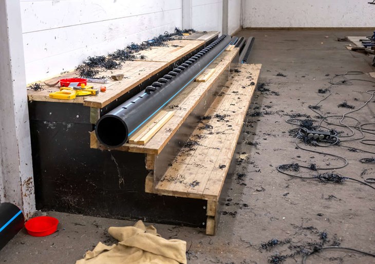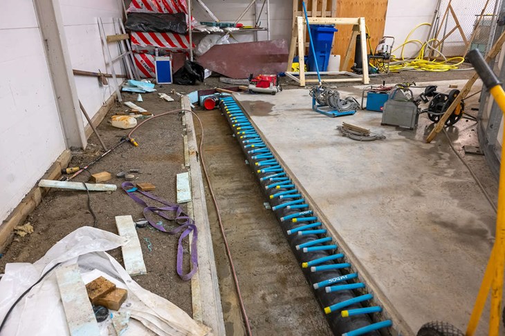STAMRÖR. 30 rörkopplingar i polyten på varje stamrör ska kopplas samman med alla de mindre rör som ligger under B-hallens ispist. Foto: Roffe Andersson