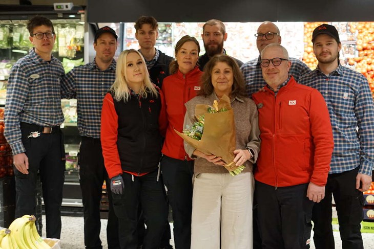 TEAM. Kollegorna i matbutiken tackar Maria för ett kvarts sekel av trogen tjänst. Foto: Loke Johansson