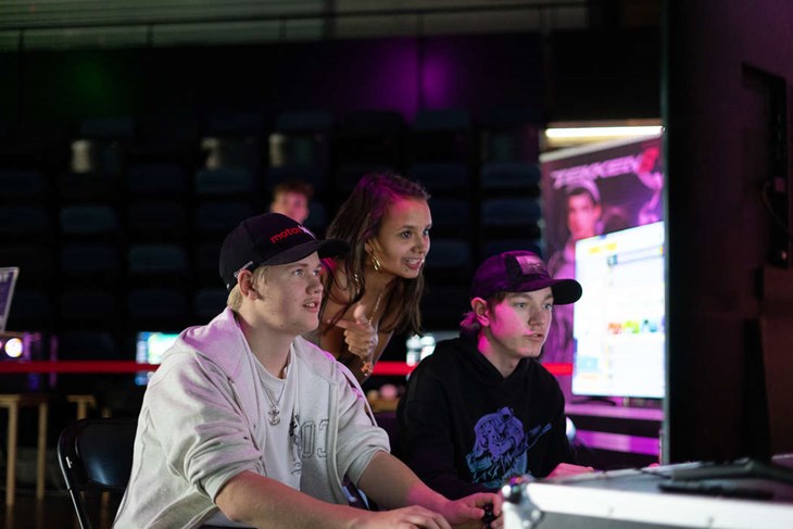 TEKKEN. Leilah Hamed, 16, Hugo Larsson, 17, Emil Lindrot, 15 körde Tekken 8 på arkad stickor. Ett spel Leilah spelat mycket hemma. Foto: Victoria Rubinsson