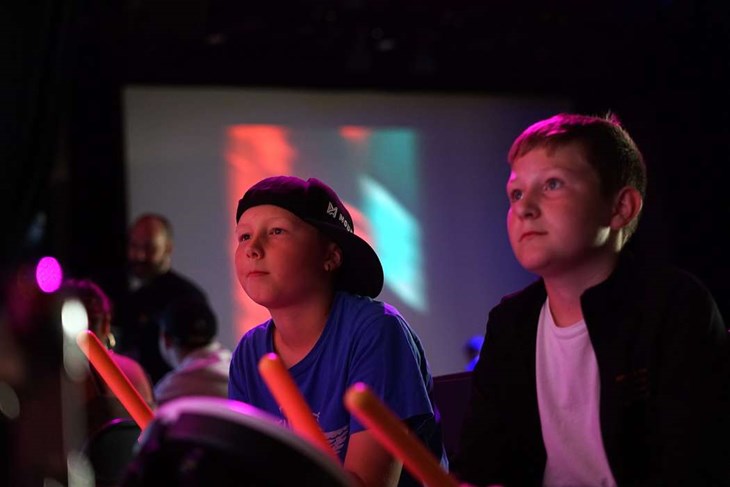 TRUMSPEL. Love Heiskanen, 12 och Oscar Moberg, 12 spelade trummor på en spelkonsoll från Japan. Båda två tyckte spelfestivalen var kul och hade fått lappar om den i skolan. Foto: Victoria Rubinsson