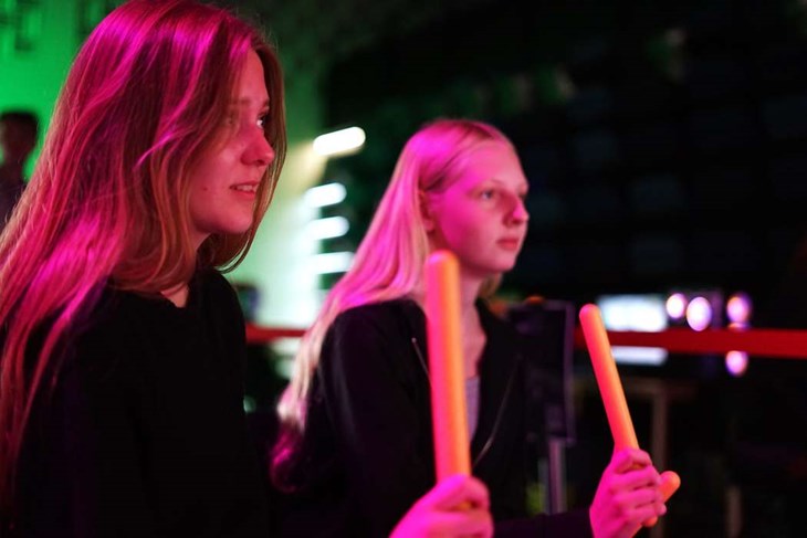 Vid en konsol satt Julia Nordfors, 15 och Lovisa Flodin, 15 och spelade ett spel som liknade Guitar hero men med trummor. De tänkte egentligen bara titta på.
