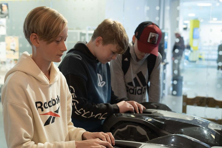 En trappa ner fanns flera Xbox och kompisarna Oscar Hörström, 12, Alfred Bengtsson, 12, och Viktor Modée, 12 hade hittat till en udda konsol i ena hörnet. En robotgräsklippare som det gick att spela DOOM från 1993 på.