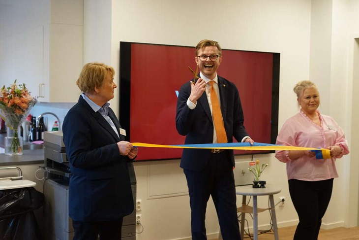 INVIGNING. Kommunstyrelsens ordförande Johan Skog klipper bandet. Foto: Loke Johansson