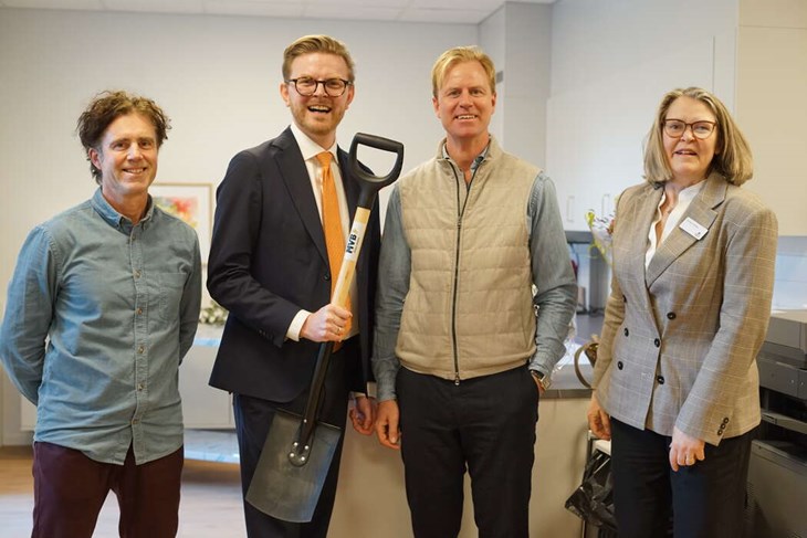 MINGEL. Projektledaren Oskar Rudbeck, KSO Johan Skog, projektchefen Nils Resvik och kommundirektör Annika Hellberg. Foto: Loke Johansson
