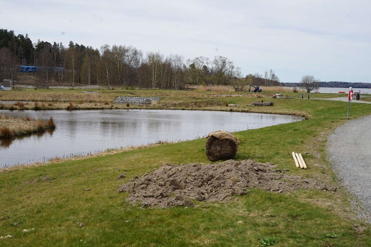 VÅRFIXAS. Här ska det snart bli träd runt dammarna och fler platser där man i sommar kan söka skugga under den gassande solen. Foto: Loke Johansson