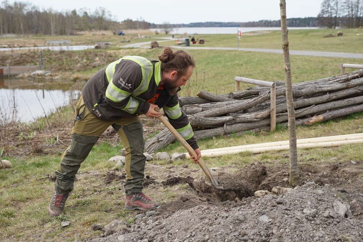 Våtmarksparken, 07:58. Här står arboristen Sindre Häggström och brottas med en jordgrop, men med ett sällsynt strålande humör. Det här har varit hans arbetsplats i tre dagar, men det är fortfarande många träd kvar som ska ner i jorden runt dammarna.