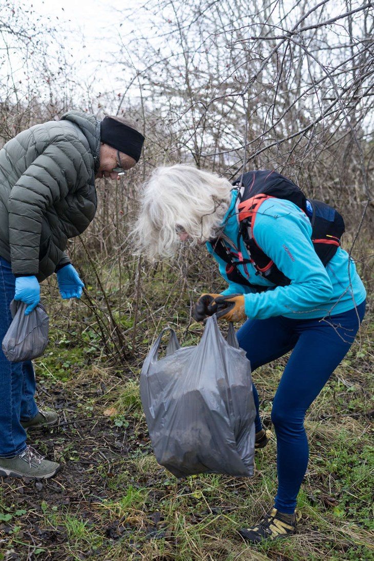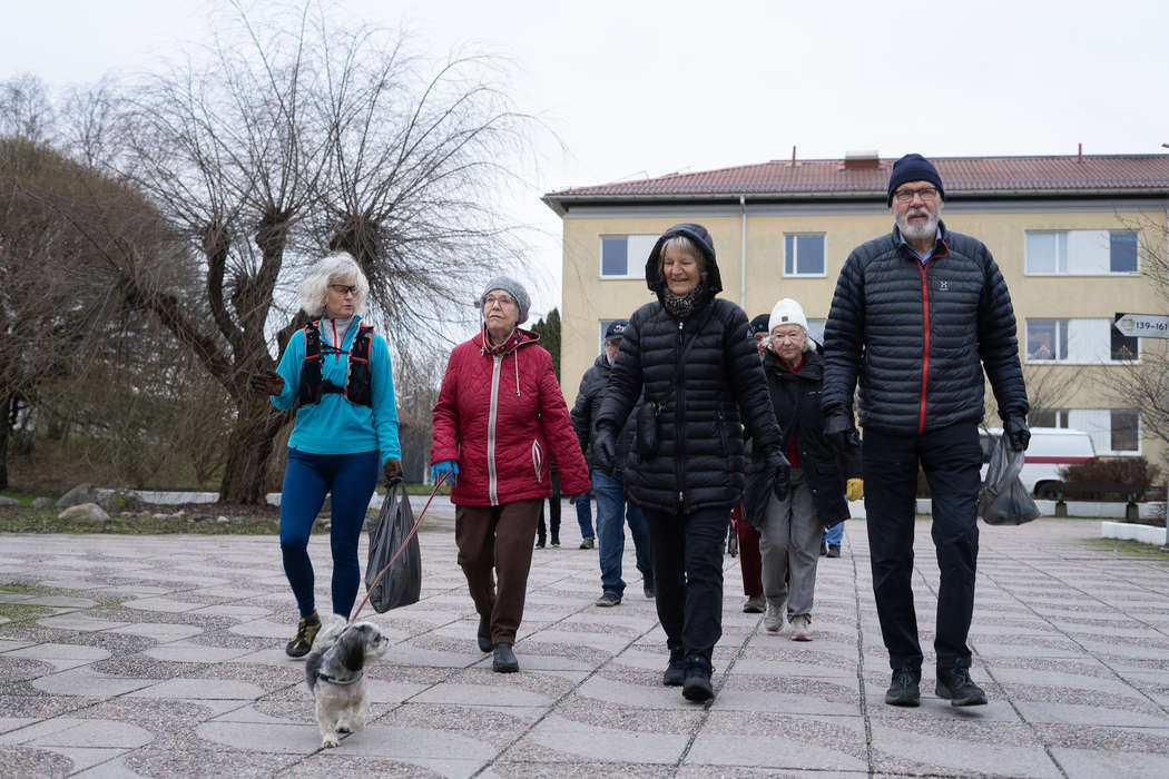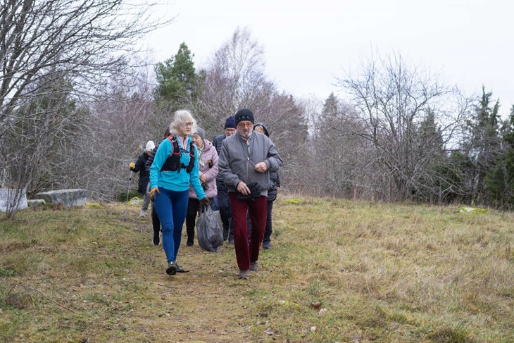 Till och från plockas skräp upp från gångvägen och diken under promenaden.