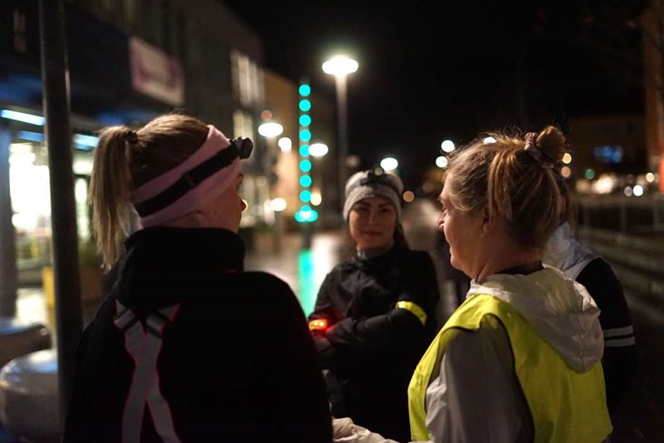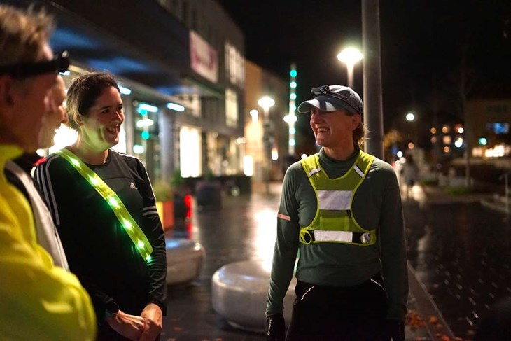 När det är tio minuter kvar till kvällens pass börjar löparna en efter en trilla in till samlingsplatsen. Vissa har varit med några gånger medan andra är med för första gången. Alla har reflexer och några har skaffat pannlampor för extra ljus. Tisdagskvällen i början av november är varm för årstiden men vad som händer när vintern kommer råder delade meningar om i gruppen.