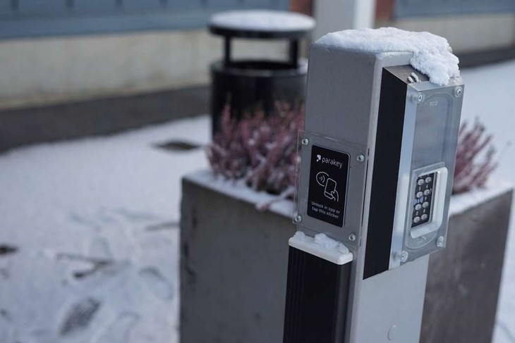 Några dagar efter Vallentuna gymnasiums entré låstes för obehöriga funkar den tekniska lösningen som tänkt. Vid entrén kommer elever som tar upp telefonen, blippar den mot en stolpe utanför entrén och går in genom den upplåsta dörren.