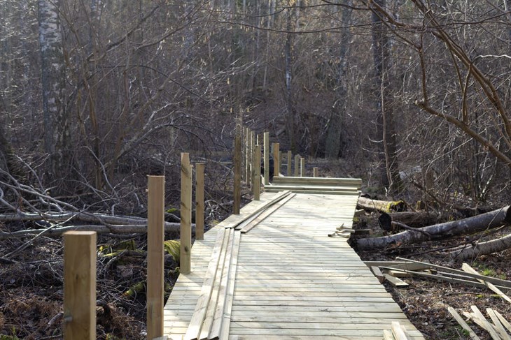 FORTSÄTTER. Efter vintern har nu tjälen börjat släppa ur marken och arbetet med att påla området för sista delen av spängerna och plattformen har påbörjats. Foto: Victoria Rubinsson