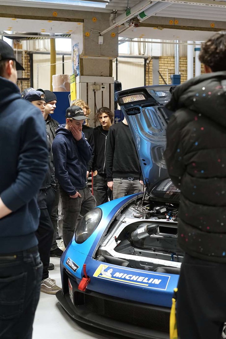 Inne i lokalerna på fordons- och transportprogrammet har en blå Porsche körts in, en Volkswagen minibuss och skåpbilar fyllda med verktyg. Det var dragracingföraren och numera teamchefen Mikael Kågered och hans skolprojekt ”Verktygslära och racing på schemat” som var på besök för att prata racing, bilar, verktyg och oljor.