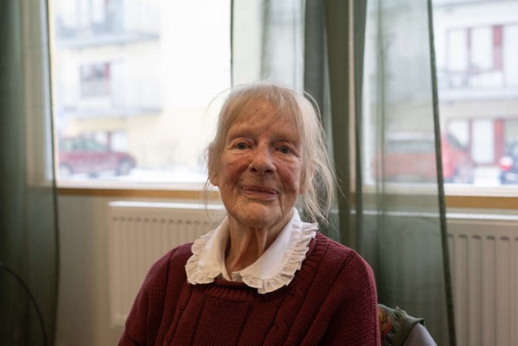 VANA. Inga Kvick tog rullatorn till Träffpunkten i ett snöigt Vallentuna. För henne har verksamhetens nya möbler blivit en vana. Foto: Victoria Rubinsson