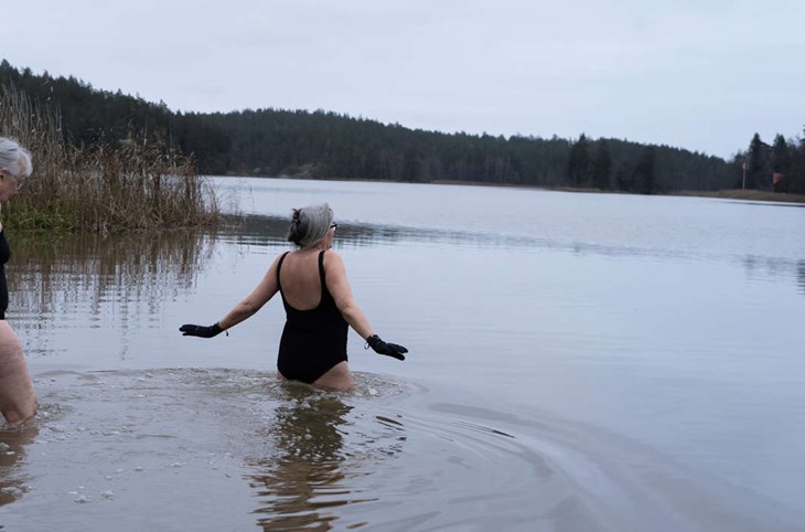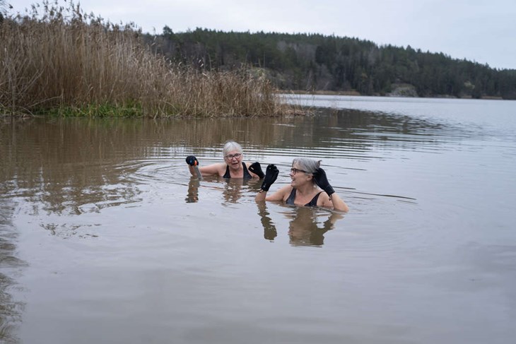 KALLBADARNA. Trots att december inte bjuder på någon vinterkänsla hittar kallbadarna i Brottby både glädje och lugn när de tillsammans tar sig ett kallt dopp vid Toftesta holme. Foto: Victoria Rubinsson