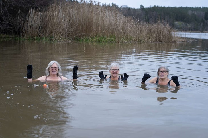 En grå torsdagsförmiddag med åtta plusgrader har en tapper trio bestående av Mia Lindh, Carina Rehnsfeldt och Kerstin Pettersson tagit sig till Toftesta holme i Brottby med baddräkter, simskor och vantar för att ta sig ett kallbad.