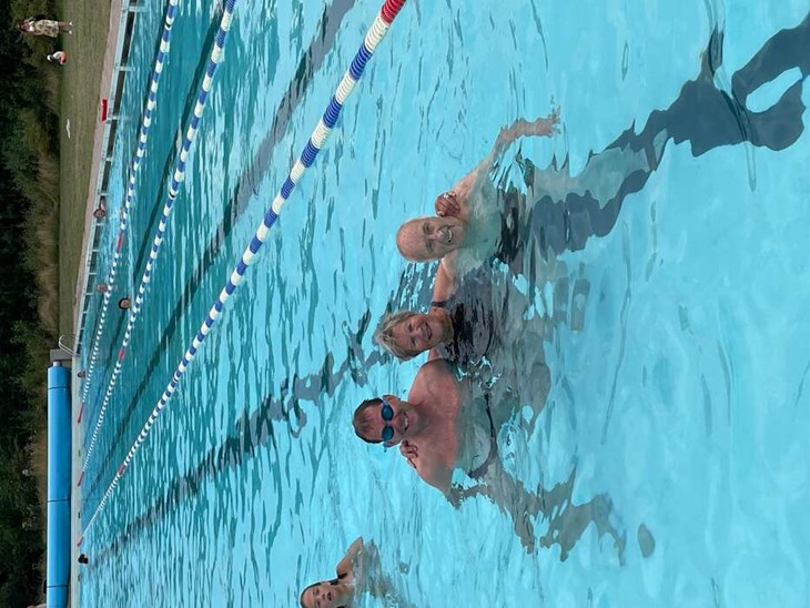 BADSUGNA. Lars Carlsson (C), ordförande i fritidsnämnden och Birgitta Karlsson (KD), mångårig simlärare på Kvarnbadet och Uno Sköld (S), som var chef för fritidsförvaltningen när Kvarnbadet byggdes 1970, tar en simtur tillsammans i 50-metersbassängen. Foto: Anneli Leijel