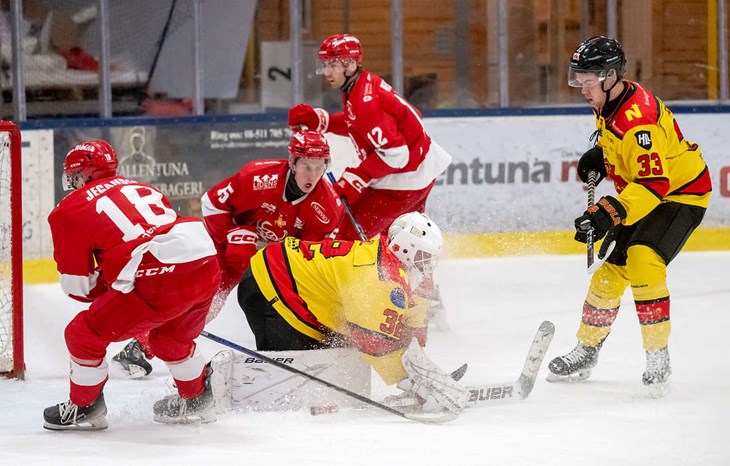 MÅLTORKA. Vallentuna vann skottstatistiken, pucken stannade dock nio gånger av tio på Anton Danell i Norrtäljes mål. Foto: Roffe Andersson