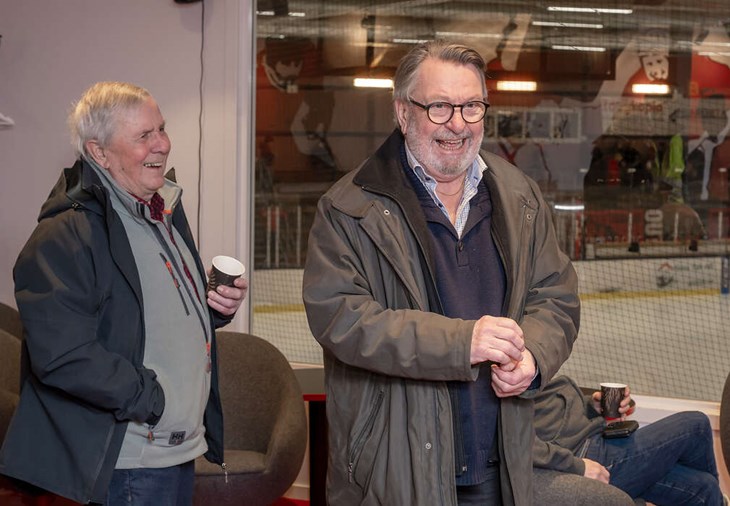 MÅNGA SKRATT. Före detta ordföranden Lars Holm och före detta lagledaren Peter Lektorp hade mycket att minnas från åren med Yngvar Söderström. Foto: Roffe Andersson