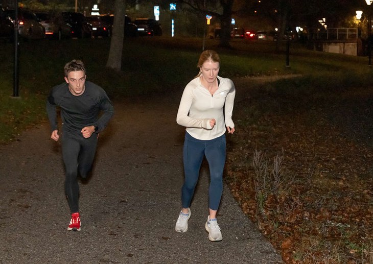 Emil har räknat ner och de sticker iväg. Hundägare och cyklister längs Nils Göranssons promenad får maka på sig när duon rusar fram. De springer 500 meter, vilar kort och vänder tillbaka. Tre kilometer senare plockar de fram testbagen under båtklubbens fasadlampa. Nålar, mätdosa, papper.