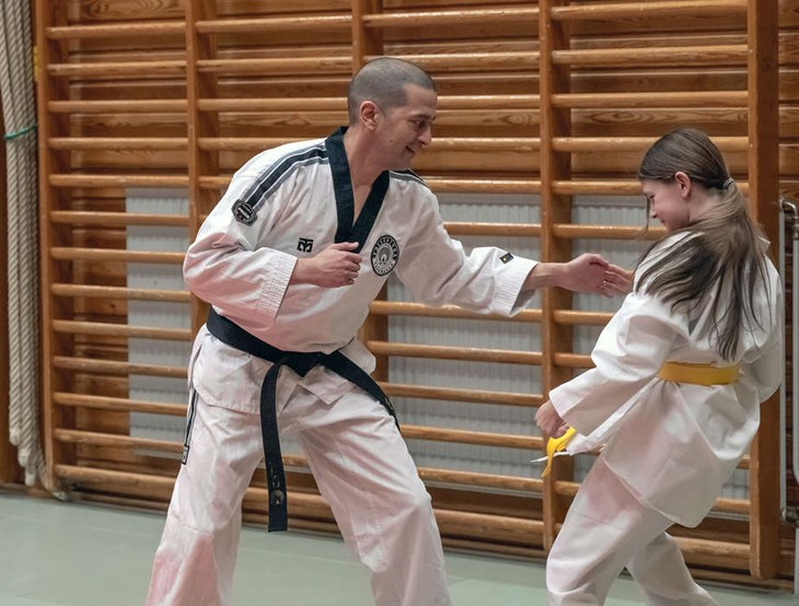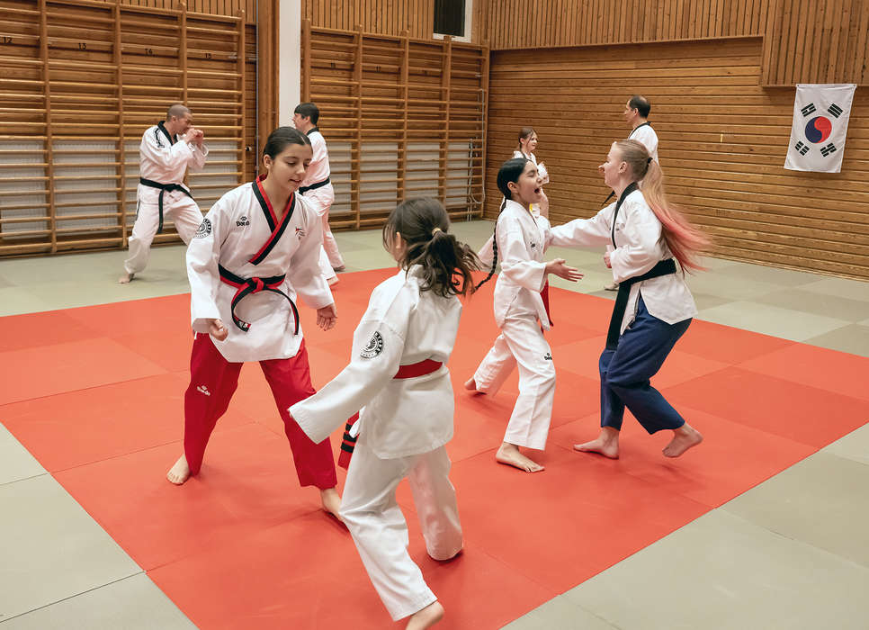Inifrån hallen hörs nu sorlet från en stor barngrupp – till 98 procent flickor – som är redo att träna. Edgard, Gregor och Patrik Frykstedt, kvällens instruktörstrio, bugar respektfullt när de kliver in i dojang. Uppvärmningen kryddas med lek där armbågarna ska skyddas från att träffas av motståndarens händer. Allt sker lugnt och pedagogiskt. När spark- och slagkuddarna plockas fram är Edgard noga med att sparkarna hålls låga.