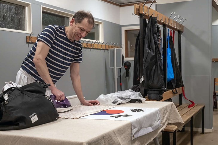 Edgard George och instruktören Gregor Reveberg är först på plats när klubben tjuvstartar säsongen för ungdomar som är extra angelägna om att komma i gång. Stämningen blir snabbt uppsluppen när Gregor plockar fram ett strykjärn för att snygga till klubbens sydkoreanska flagga. Den ska hänga på kortväggen i träningshallen.
