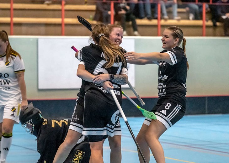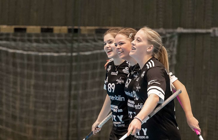 GLÄDJE. Vallentuna nådde inte ända fram men det fanns stunder av glädje. Som när Sofie Björnsjö, Ida Nedin och Ebba Legnestam firar reduceringsmålet till 2–3. Foto: Roffe Andersson